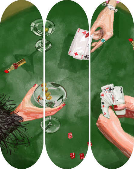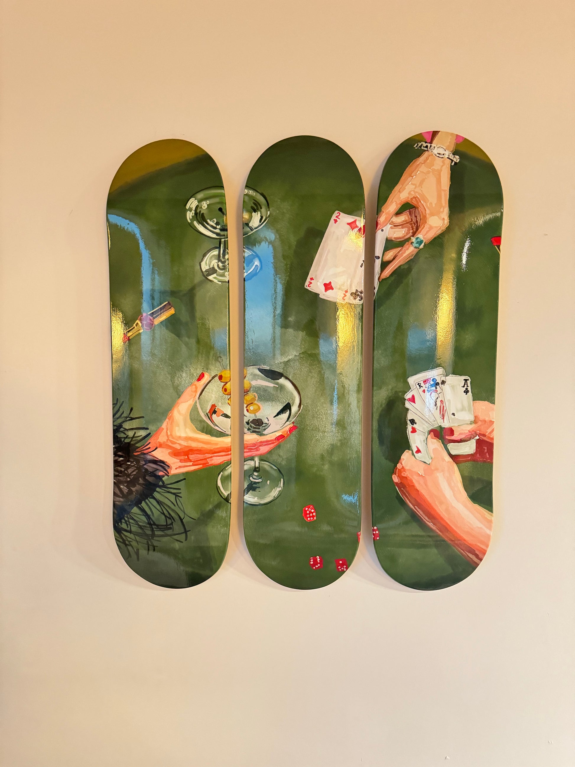 Each set is made to order and handcrafted using wood skateboard decks. While these decks are built from durable, high-quality materials, they are intended for decorative display only — trucks and wheels are not included, and they are not designed for actual skating.
